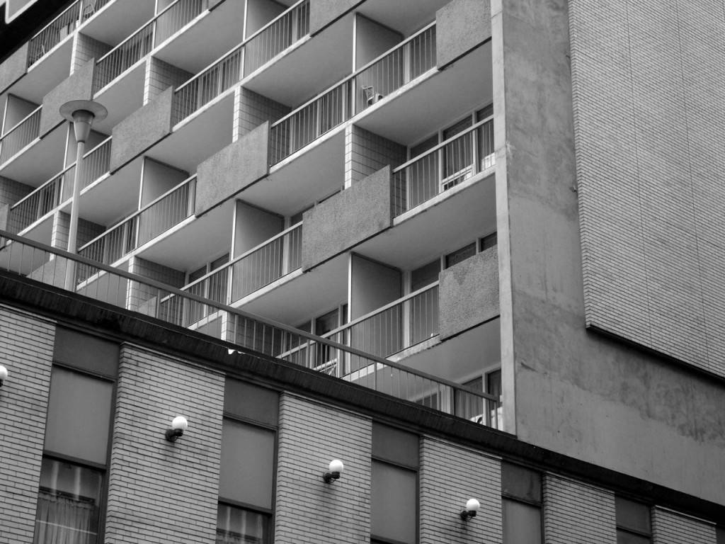 A view of the Ramada Inn in Calgary, showing the repetitive pattern of the balconies overlooking the pool deck.
